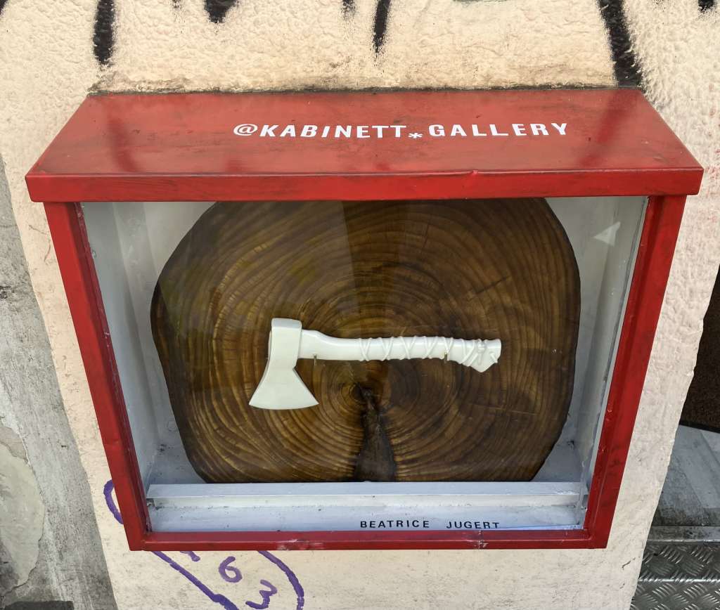 The annual rings of the tree perhaps bring to mind fire hoses, which often hang in such boxes for safety in an emergency. At the same time, for me they are also an image of our limited lifespan in which we find ourselves in existential situations with varying degrees of frequency and intensity.