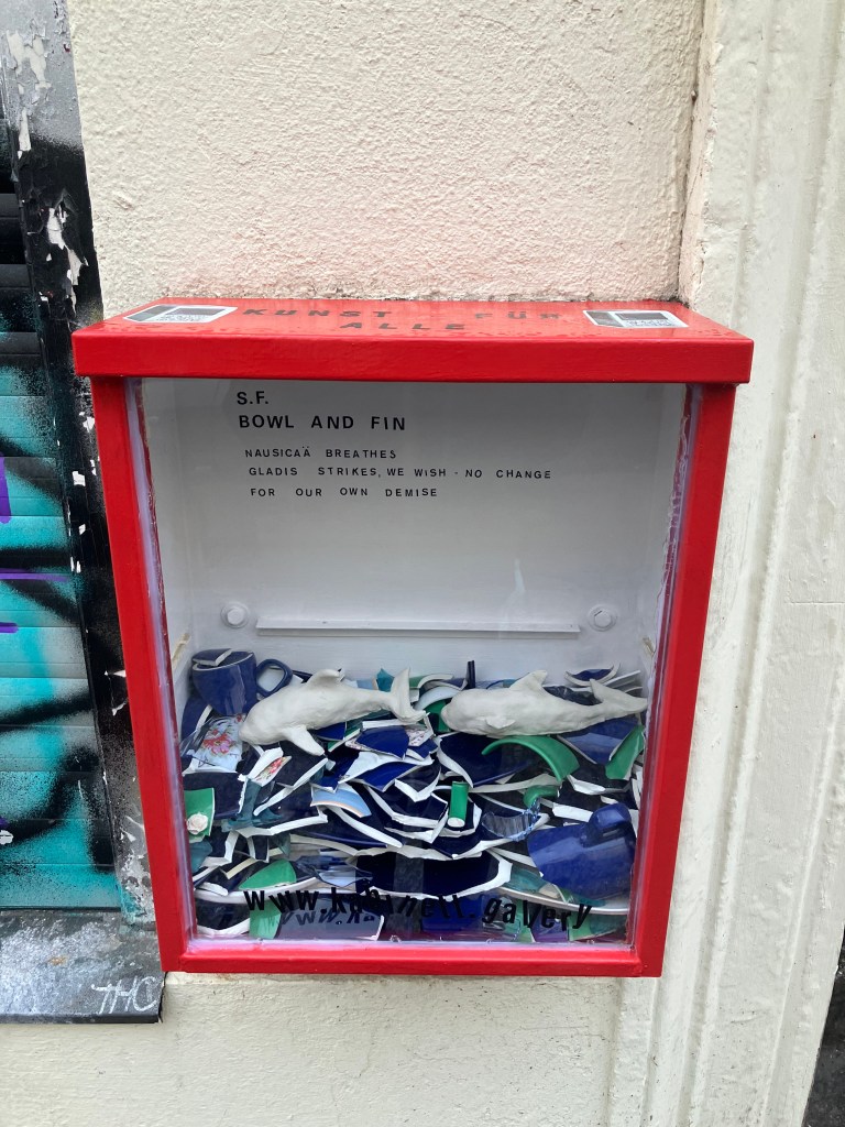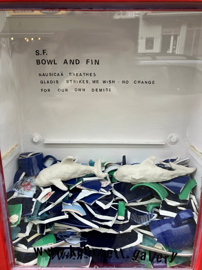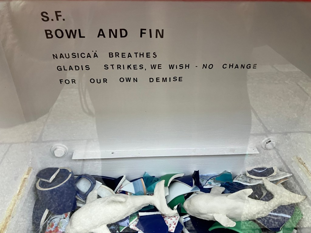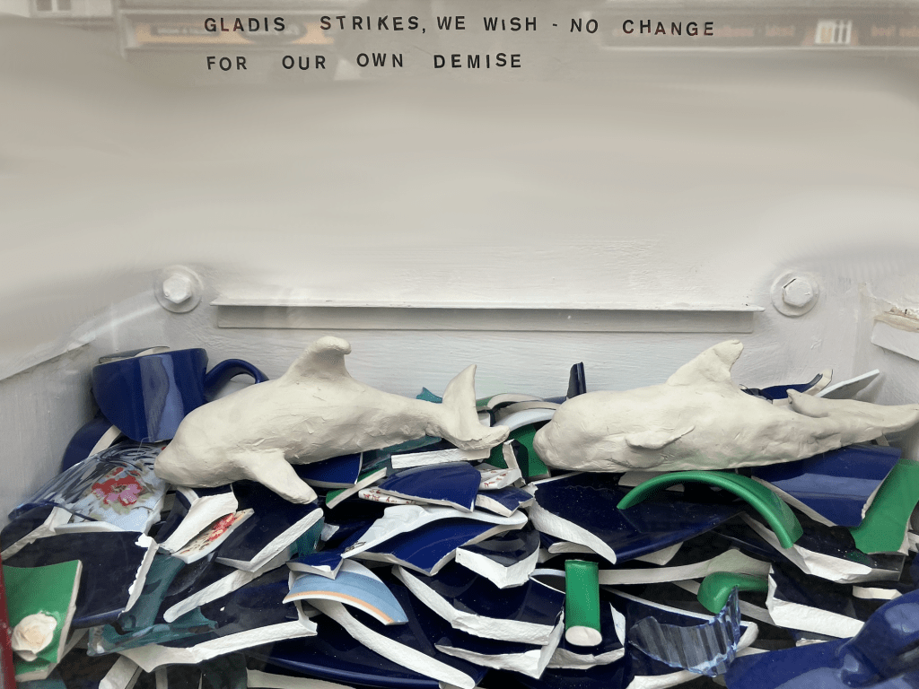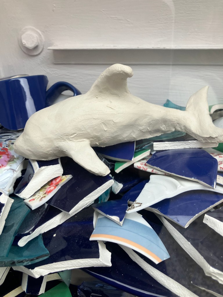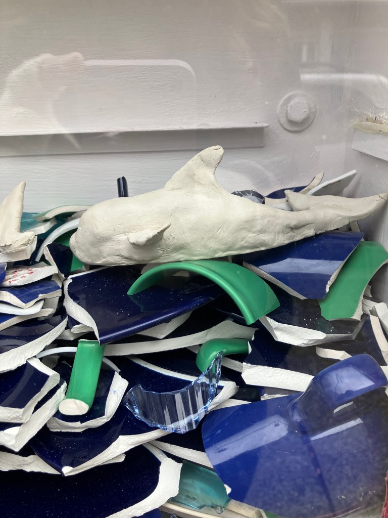 Two unfired clay orcas, Gladis & Nausicäa, swim inside of an ocean of glossy ceramic shards — behind them, a haiku.