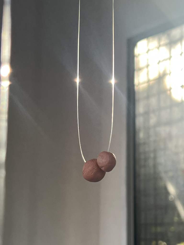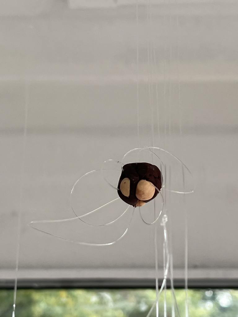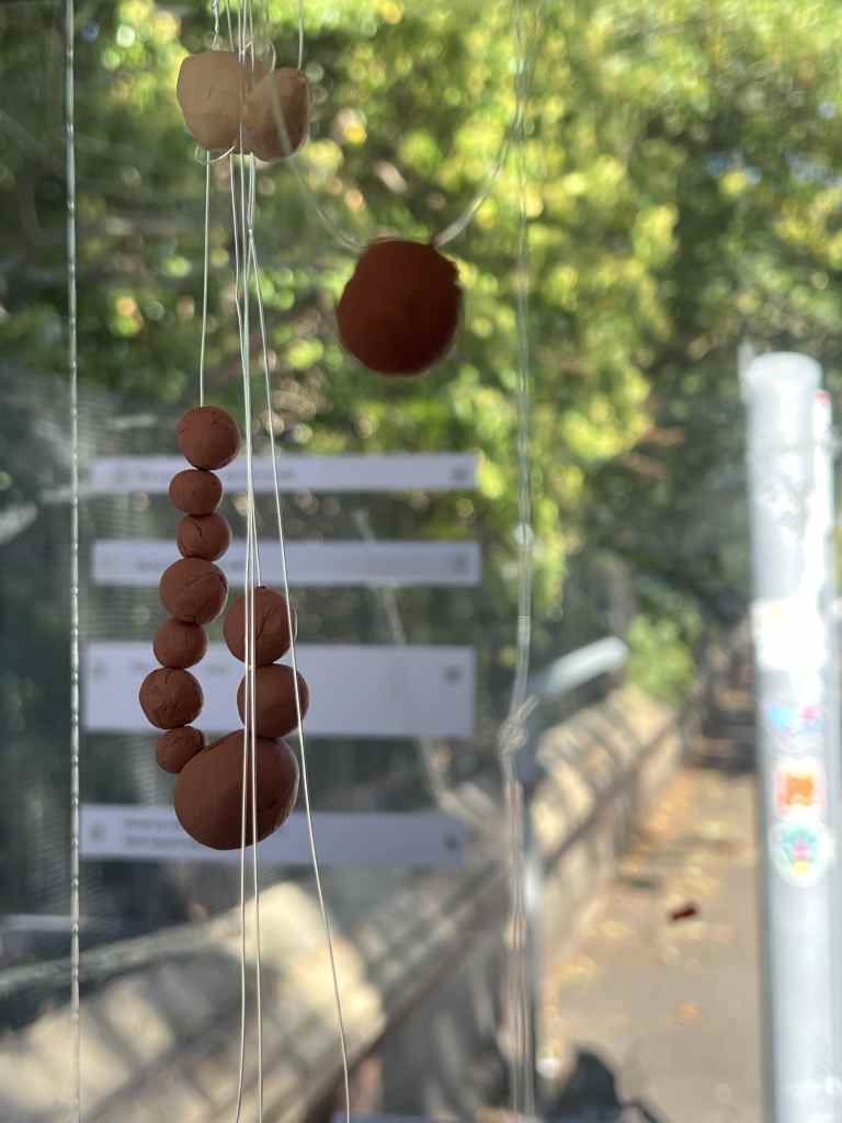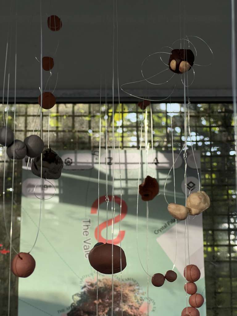 Here, apples hang on fish wire, echoing the act of looking up into branches. They also hang as questions: what is offered, what is withheld, and how do we navigate the space between public and private?