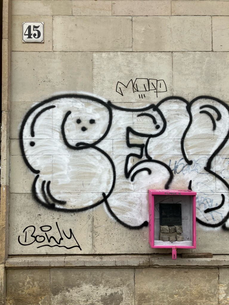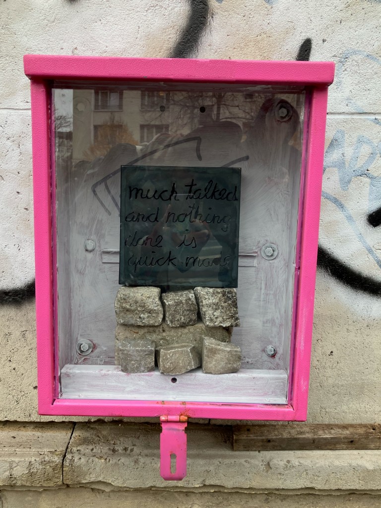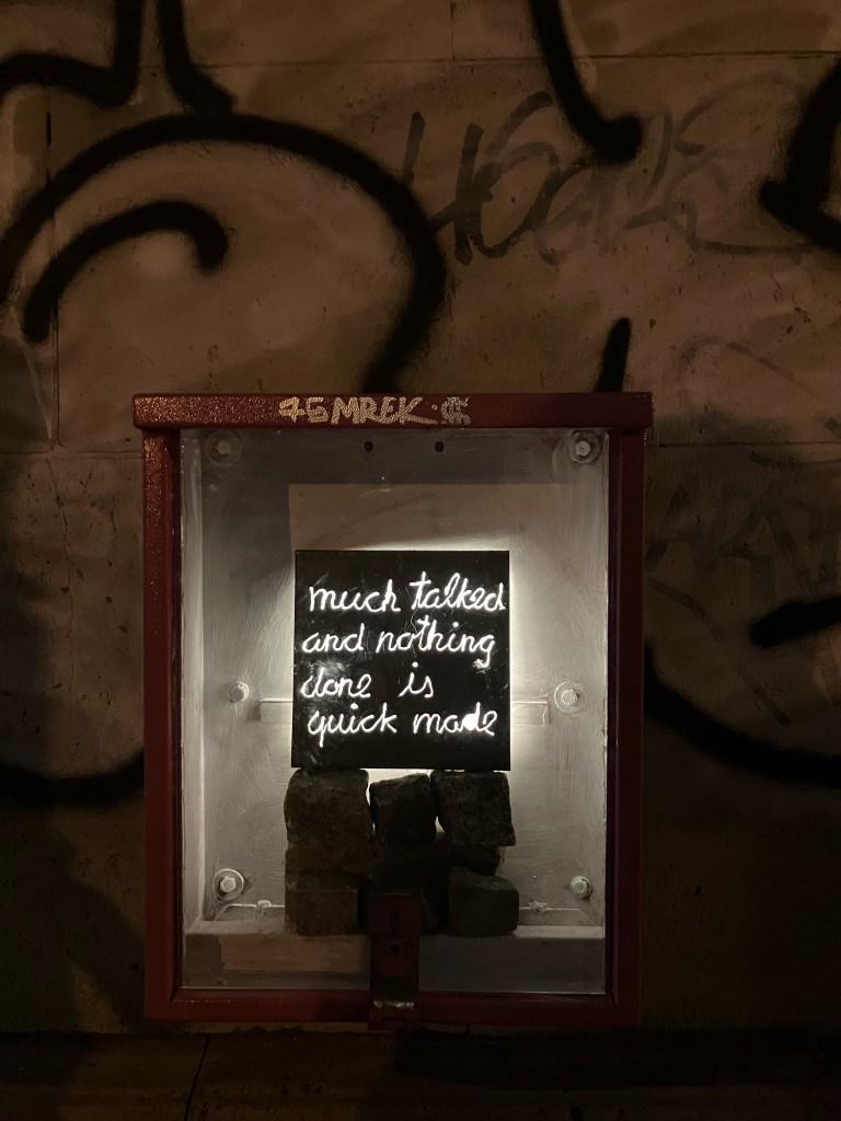 The LED-illuminated sculpture sits atop a pile of cobblestones, an iconic token of Berlin streets. The square cut granite cubes comprise the majority of Berlin’s streets and have strong associations to counter culture and resistance.