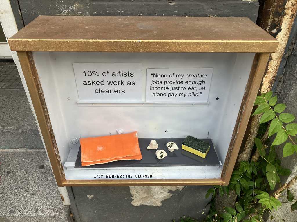 During her research Hughes conducted a survey of 120 artists who, like her, hold second jobs — 10% of them in cleaning, others in hospitality or education. The overwhelming response was one of financial instability, exhaustion, and emotional strain.