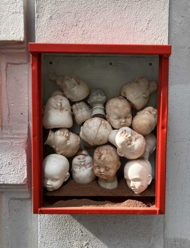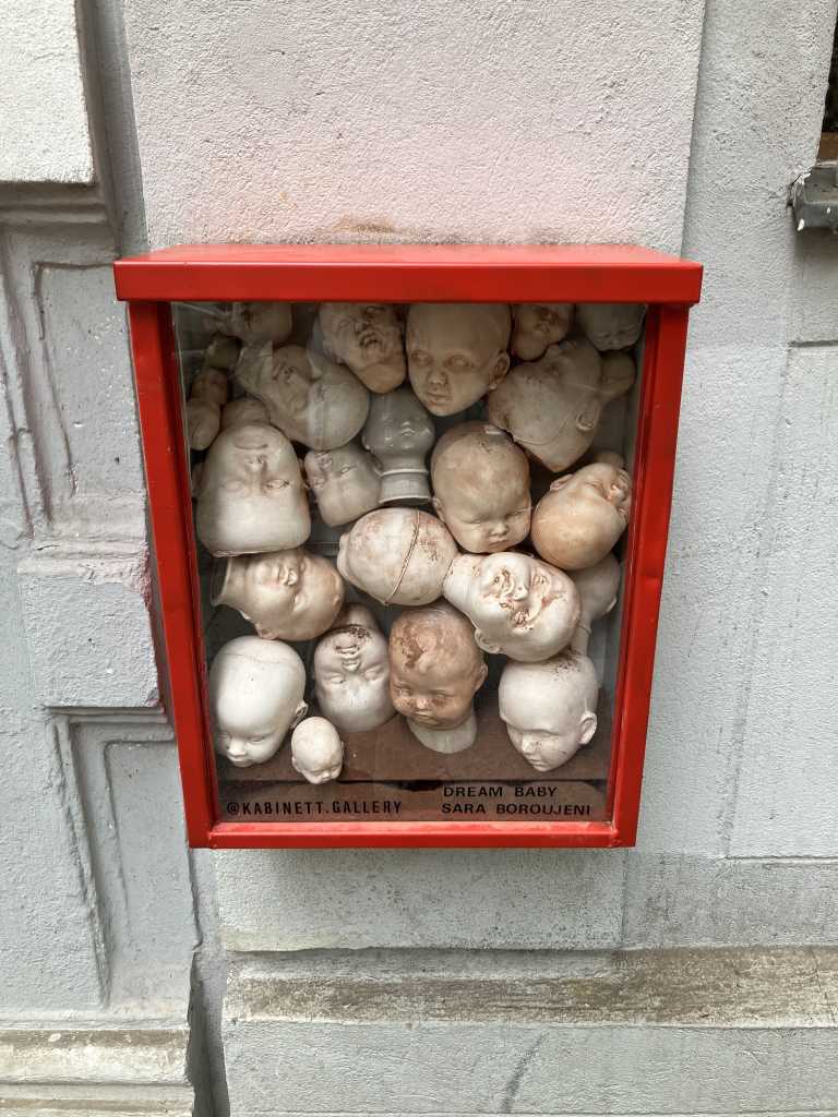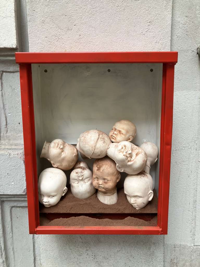 In one Kabinett, a dozen delicate ceramic cast baby faces press against one another, stacked seemingly haphazardly within a tight frame.